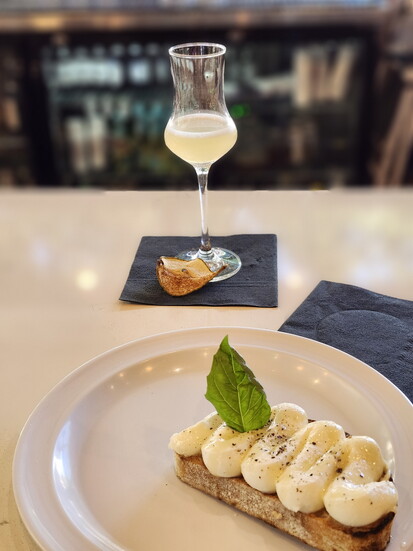 This duo not only prepared the 3 required cocktails but crafted a full pairing with incoming autumnal plates. Starting with their signature cocktail, which also happens to be the winner, Pear’d In Spice. A spiced rum with pear liqueur, apple juice, house-made cinnamon simple syrup, and lemon juice, garnished with a dehydrated pear slice, and paired with their Honey Whipped Ricotta Toast.