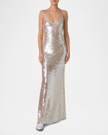 A clean slip silhouette with delicate straps- understated chic lit up by full sequin shimmer.