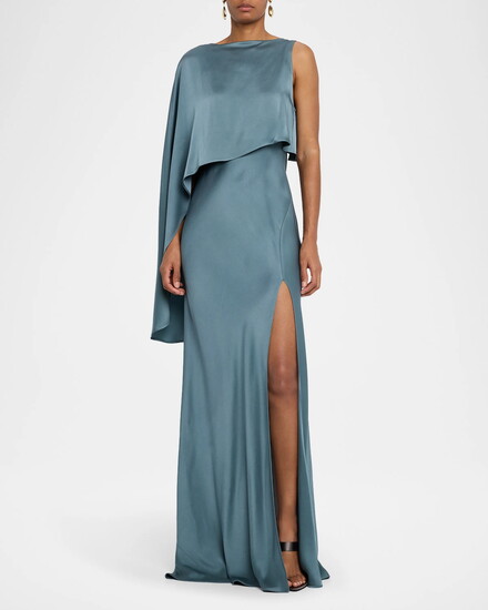 Fluid teal satin draped with minimalist drama; sophisticated and striking without embellishment.