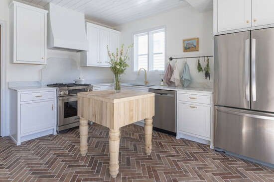 A 1908 home recently received a new kitchen designed to feel seamless with the rest of the house. Much of the design focused on creating a space that was predominantly white while still feeling colorful—using patterned tile on the floor, removing the pantry walls, and opening the space to the kitchen. Vintage elements were intentionally layered in, including hardware likely dating to the 1940s or ’50s, which Barnes cleaned and restored to shine like new.