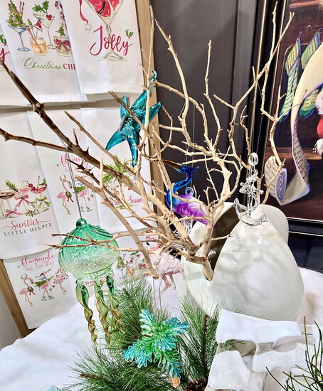 Rene Perry of Breakwater Home Fashions embraces the other end of the spectrum: exuberant fun. Her coastal-themed boutique glitters with oversized glass ornaments—sailboats, turtles, martinis, even octopuses—each a wink of seaside cheer. “People want to bring on the fun,” she said, describing two prevailing trends: earthy nostalgia in deep forest greens and burgundies accented with warm brass, and the whimsical sparkle of mint, pink, and silver. “It’s either really glittery or very natural—there’s no in-between.”