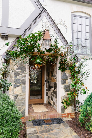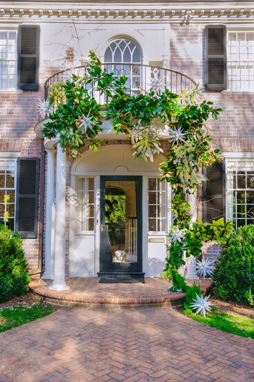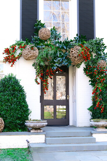 Large grapevine balls are suspended above the doorway of an Eastover home, adorned with draped holly berries and greenery. The effect feels more like a striking art installation than a front door, but that’s the magic of Jay Lugibihl’s so-called “holiday doors.”