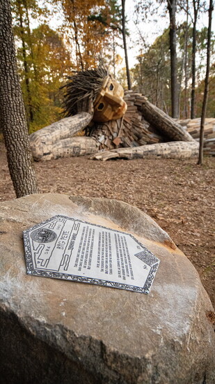 Five are scattered around Dix Park in Raleigh. Daddy Bird Eye sits beneath a large tree, holding a giant staff and keeping watch over the park. Elsewhere, Mother Strong Tail takes a nap with one eye open, presumably tired from watching over her three youngest children. The baby, a little girl troll named Dix, stands at the edge of the woods holding her mother’s impressively long 645-foot tail, while her brothers Dax and Dux play a game of hide and seek across the way.