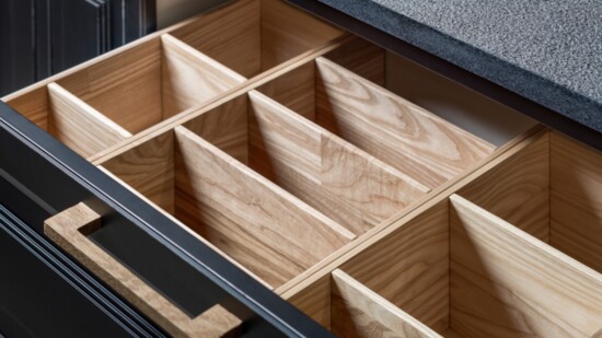 We see many kitchens trading upper cabinets for large, deep drawers. These can quickly become a mess with so much space, but there's a solution for optimization. Tall spring-loaded dividers help keep things neat.