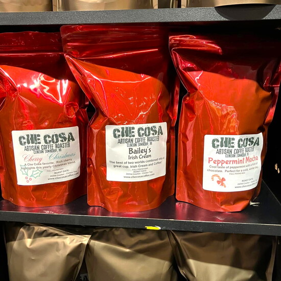Savor the season with festive blends like Cherry Christmas and Reindeer Crunch — freshly roasted to perfection. Also featuring rare Jamaican Blue Mountain and Hawaiian Kona. Available at Che Cosa Coffee, 24394 Crocker Blvd, Clinton Twp.