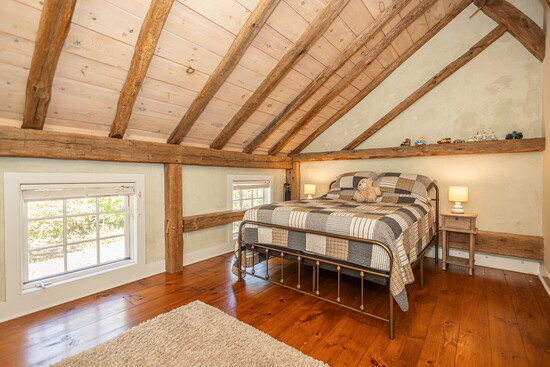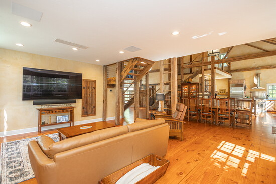 This estate also includes a second residence: a restored barn house, circa 1840 and relocated from Kutztown, Pennsylvania. The barn-home offers three bedrooms, all en-suite, a full pool bathroom, gourmet kitchen, soapstone countertops, cabinetry fashioned from reclaimed barn wood, expansive ceilings, large windows, wide-plank floors, two prominent turned staircases and Moravian tile mosaics.