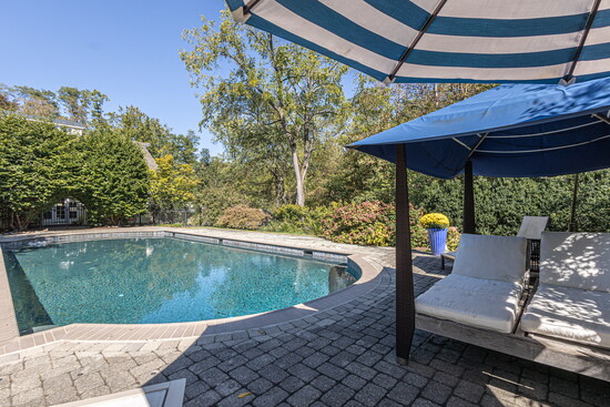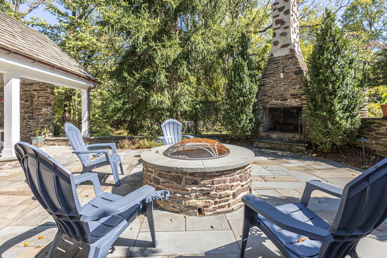 Outdoor features include a rectangular inground pool surrounded by landscaped gardens and paver patios, three-season entertainment area, substantial stone fireplace and fire pit.