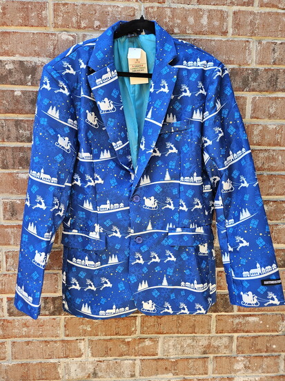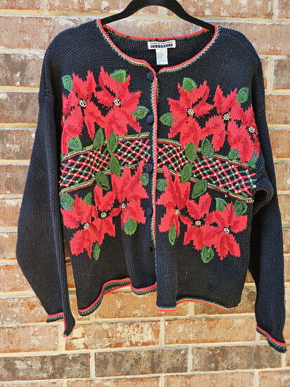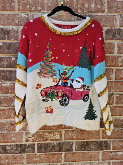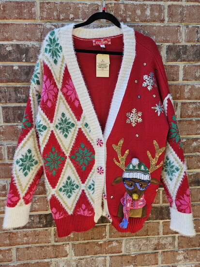 By January 2024, Melissa began collecting sweaters to give them new life for the holiday season. Most sweaters are thrifted finds, upcycled into joyful conversation starters. “I like to joke that they come from the North Pole. People usually wear a sweater for a season or two, then it sits in a closet. Giving it a new home makes sense and it’s fun!” she explains.