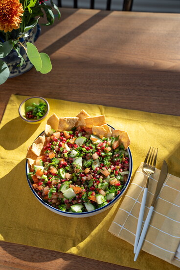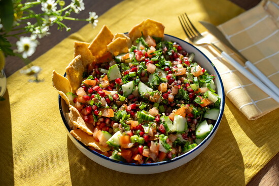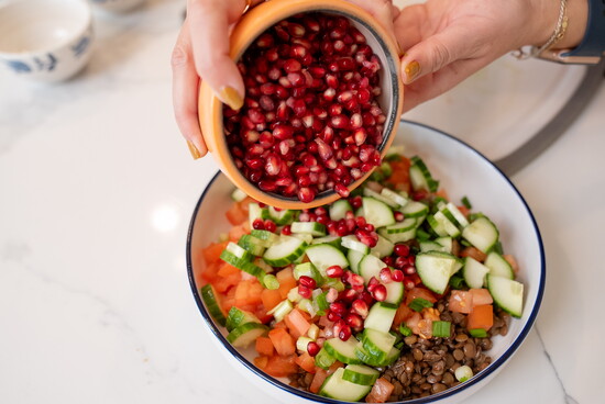 - Add the cooled lentils to a large bowl, then fold in the parsley, green onions, cucumber, tomatoes and pomegranate arils.
