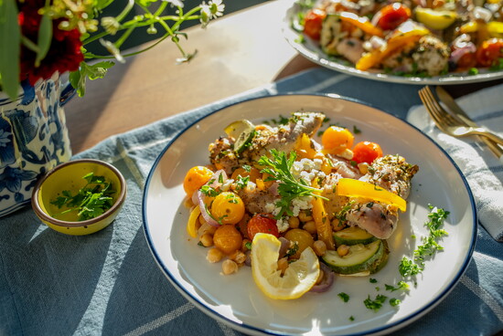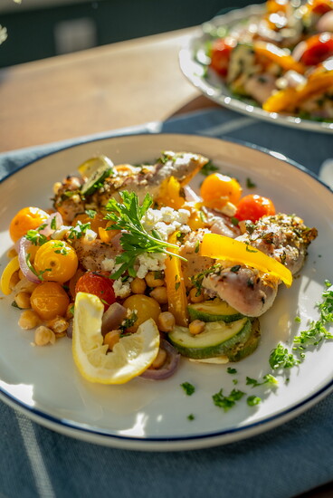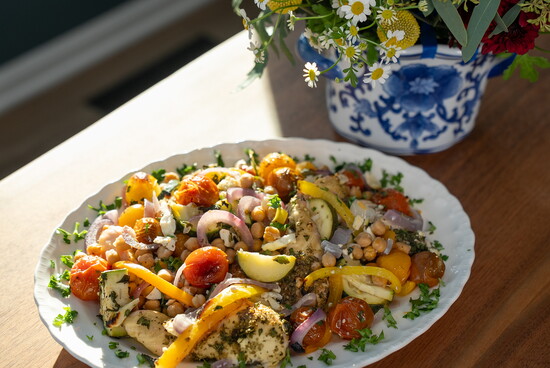 Greek Sheet Pan Chicken with Veggies & Chickpeas