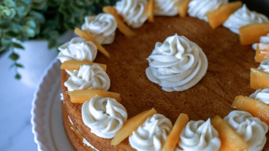 Place on the second layer and decorate the top with the rest of the frosting, fresh mango, and/or optionally candied orange or coconut.