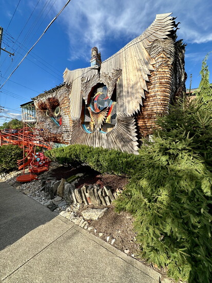 Tucked into a residential block in East Hyde Park, Wahopi—often called the “mushroom house”—stands apart from its surroundings. Designed and built beginning in 1992 by architect Terry Brown, the structure was originally known as “The Studio.” Brown’s early design work is known as Wahopi, a Native American word loosely translated as “nest.”
