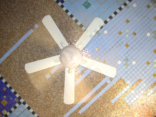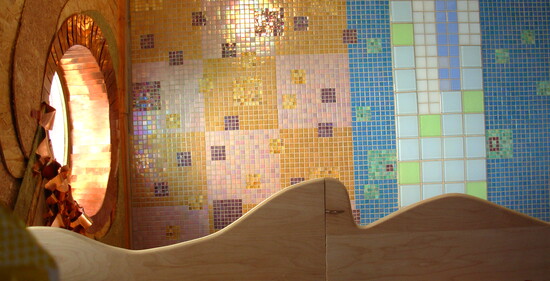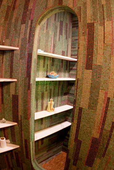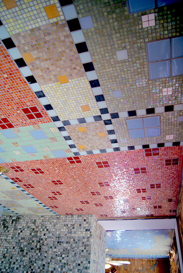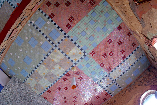 As an architecture student, Rick Wolf worked inside Wahopi layering hand-cut cedar shingles to create rippling interior walls and embellishing windows and doorways with hammered copper remnants. He was later invited to take on something entirely new: mosaicking three studio ceilings using leftover Italian glass tiles from a client’s bathroom remodel.