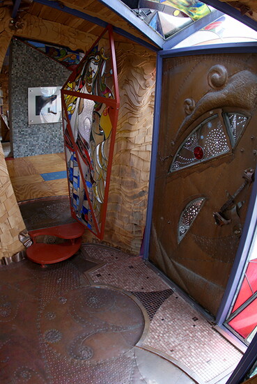 According to Rick Wolf, one of the craftsmen who helped build Wahopi, “[The house] reflects those principles through its undulating cedar shakes, lack of orthogonal [traditional right-angled] shapes...including the windows...and constant use of found or recycled materials.” All of which are trademarks of an approach that elevates what might otherwise be discarded into something intentional and expressive.