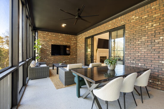 A private office with its own fireplace offers a quiet place to focus, while the formal dining room flows easily into the great room--the heart of the home. Centered around a statement fireplace, it features built-ins and a wall of glass that opens to a screened outdoor living room overlooking a wooded common area.