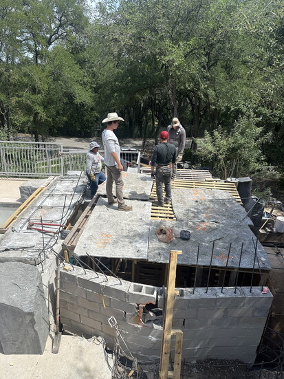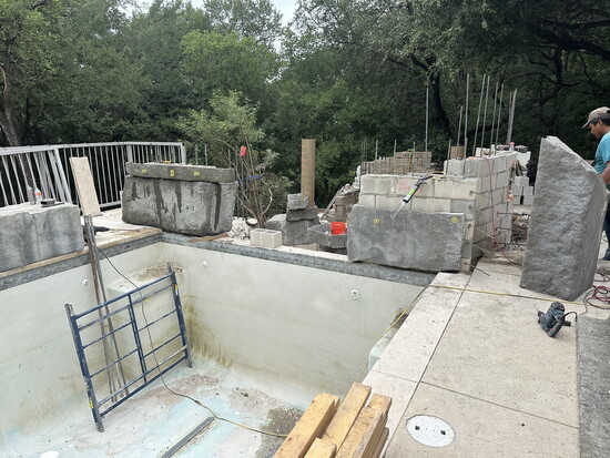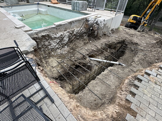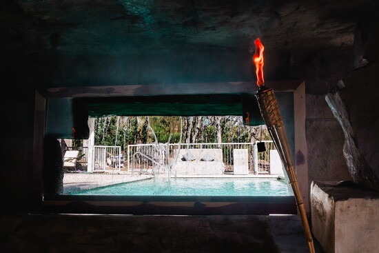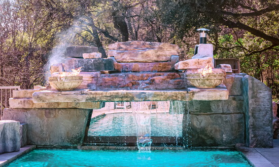 The pool maintenance project began without any spa concepts in mind. After digging a 12-foot-deep pit for structural footings, Riley saw an opportunity in the earth itself. “We had this big hole, and I thought, ‘Well, we build caves. Why not build a sunken cave?’” Riley explains.