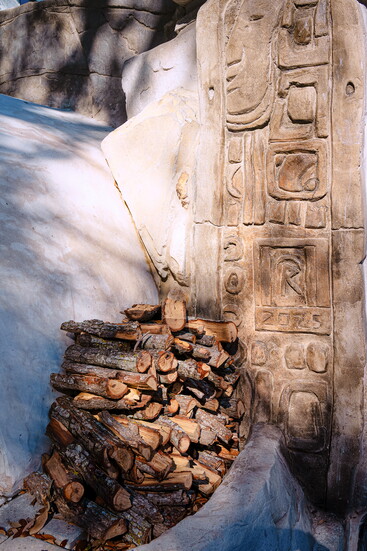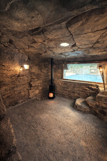 The inspiration to transform the cave into a sauna came from crew member Juan Pablo Rodriguez, of Rockstar Formations. He’d built several such caves in South Dakota, where saunas are a staple. The transition required sealing the traditionally open-air rock structure. “The hardest part is closing off the openings,” Riley notes. “If the steam escapes, obviously, you’re not going to heat up the room. You want to heat up the room to like 120º or 140º.”