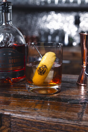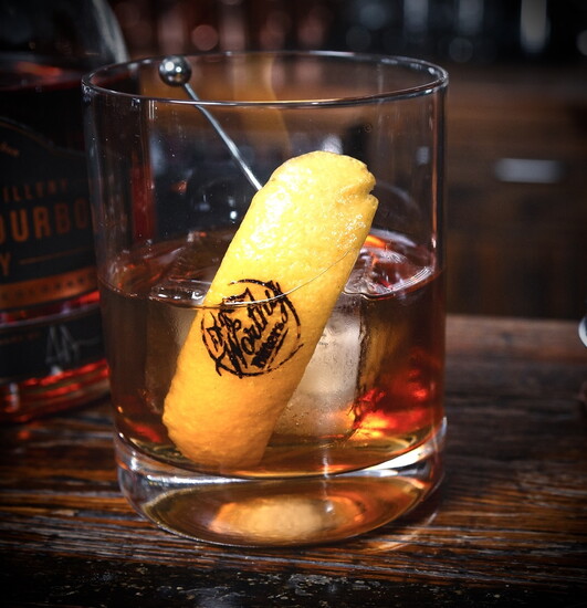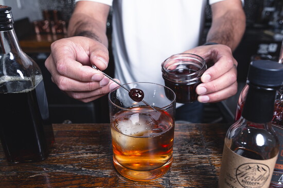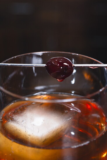 - Express orange peel, garnish w/ amarena cherry and cinnamon stick