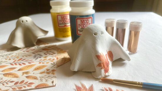 Craft Clemmy & Clementine, Mount Clemens’ own ghosts, with air-dry clay and fall flair Article and Photography by Kimberly Janowicz ONE Shape Your Ghosts │ Start with air-dry clay and a simple form—a small ball on top of a short glass wrapped in plastic for easy removal. Roll clay into a ball, then flatten into a 6-inch circle using a rolling pin. Drape clay over the form, shaping folds to resemble ghostly fabric. Use a sculpting tool or the end of a straw to press in eyes. Let dry...