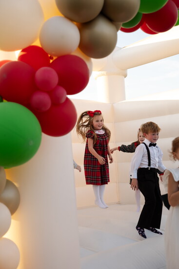 Interactive elements ensured there was something for everyone. Guests could pose for live watercolor portraits to take home as keepsakes, leave heartfelt messages for the couple on a vintage telephone, or watch children bounce with excitement in not one, but two bounce houses. “I wanted each guest to feel like they could grab a warm drink, enjoy sitting by the fire, and for the children to feel like they were part of the wedding too,” Kelbie says. “The guest portraits were something I wanted guests to be able to take home and have forever.”