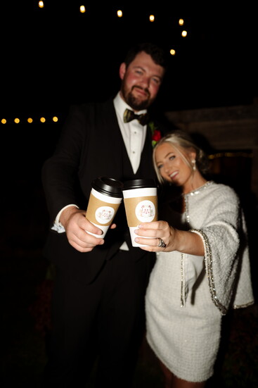 That attention to detail became especially apparent during cocktail hour and the reception. Guests were welcomed with a festive coffee bar serving hot and iced peppermint mochas, apple cider, and hot chocolate, a nod to the cozy, vintage Christmas barn atmosphere Kelbie envisioned. The bar also featured a seasonal specialty cocktail, the Grinch Peppermint Espresso Martini, alongside classic offerings.