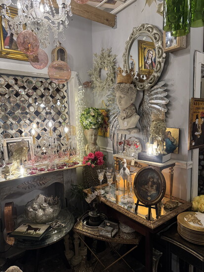 Inside, more than 70 dealers create a layered experience filled with European antiques, vintage finds, glassware, jewelry, wall art, mirrors, home decor, and furniture. Each booth reflects the personality of its dealer, giving the mall an ever-changing rhythm that keeps shoppers coming back.