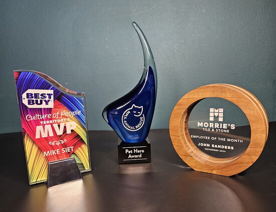 “Awards have come a long way since I began making them here. We are now able to create crystal, glass, marble, granite, and acrylic awards, as well as plaques, sculptures, commemorative plates, and even functional items such as clocks.
