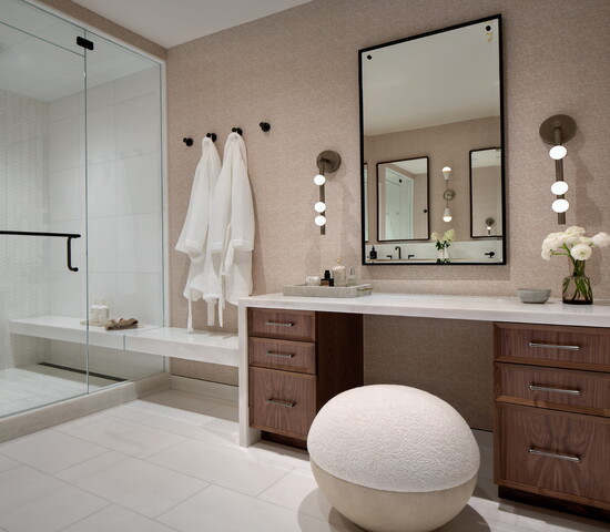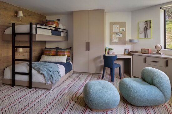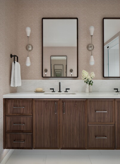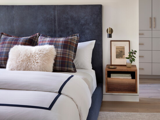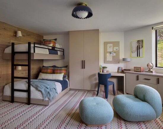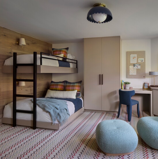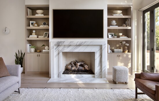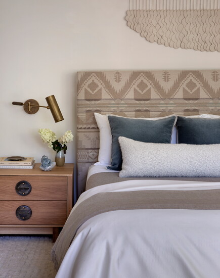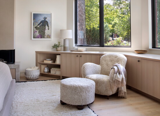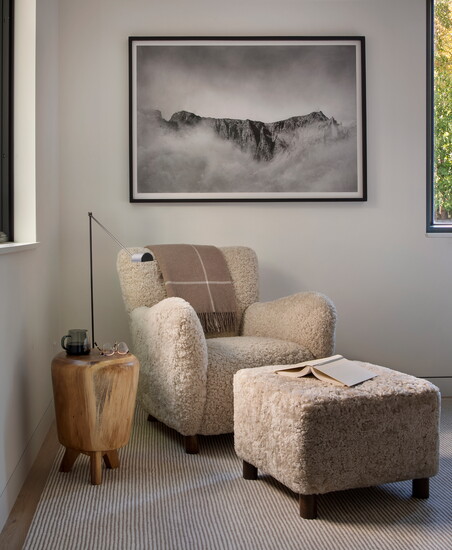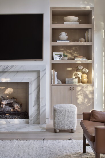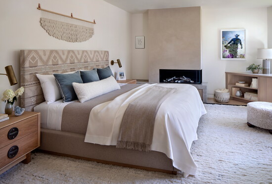 McGuire and Tenzin began the project with their Home Within approach—tuning in to what makes someone feel comfortable, grounded, inspired, and truly at home. For this family, comfort centered on warm neutrals anchored by oak flooring throughout and furnishings like the twin Montauk sofas, BassamFellows leather lounge chairs, custom Arco dining table, Thomas Hayes Studio kitchen counter stools covered in Pierre Fray fabric, and a custom primary bed with a Ralph Lauren fabric headboard. Ivory Moroccan rugs in several living spaces add texture; in the powder bathroom, an integral stone sink in Taj Mahal slab plays nicely off the terracotta floral motif Arte wallpaper. For warmth and ambiance on chilly winter evenings, a fireplace in the primary bedroom is crafted with American Clay plaster from New Mexico.