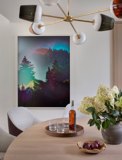 A trio of kitchen windows brings nature in with sweeping views of Red Mountain, while custom Una Malan dining chairs with aubergine-hued backs complement the purple-leaf plum trees swaying in the breeze outside. Peaceful alpine scenes are depicted in the foyer with an original painting by Rachel Garrard, and in the dining room with an original photographic collage by Terri Loewenthal.