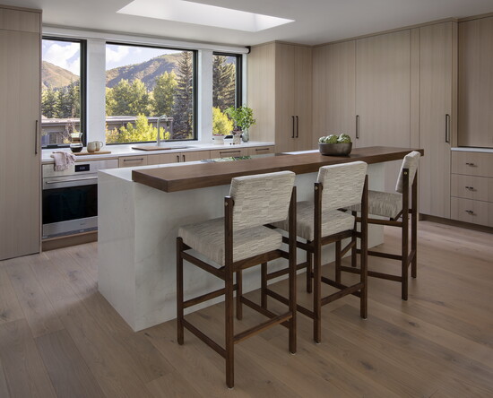 Storage was also important, so the kitchen has full-height built-ins with a pull-out pantry and a built-in bar with pocket doors. A custom mudroom displays shoes, coats, and hats; a spacious garage stores bikes, skis, and other gear. “They like to host and entertain as much as they love all the outdoor activities,” Tenzin says. “They wanted the home to feel elevated without being too formal.”