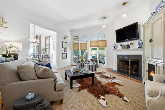 The light-filled, open floor plan is designed for everyday comfort and effortless entertaining. The keeping room flows seamlessly into a gourmet kitchen outfitted with top-of-the-line appliances, while the elegant dining area and fireside family room open to a screened porch and deck overlooking a serene, private courtyard.