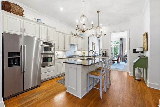 The keeping room flows seamlessly into a gourmet kitchen outfitted with top-of-the-line appliances.