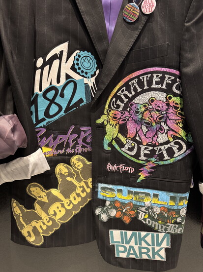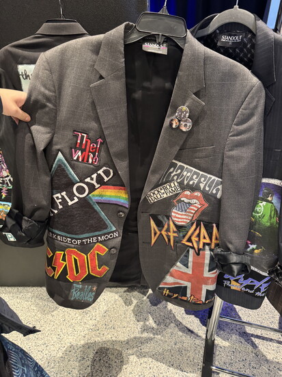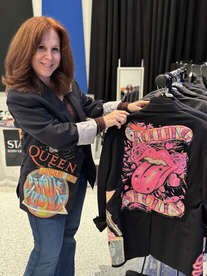Under her label, Standout Upcycled Fashion, Ryder began sourcing high-quality men’s blazers that looked nearly new. Onto them, she layered concert tees sourced from vintage and resale shops, choosing darker palettes and familiar bands. The logic is visual more than literal. “My husband will say, those bands wouldn’t play together,” she laughs. “But to me, it’s about colors and shapes.” Genre matters, but harmony matters more.
