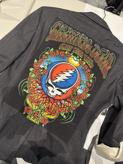 The process is slow and deliberate. Each graphic is reinforced with adhesive, stitched by hand and heat-set. Placement takes the longest. Ryder treats each jacket like a composition, adjusting until it feels right. The result is wearable memory that holds up.