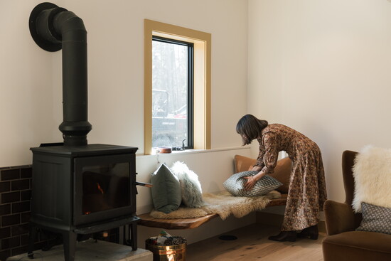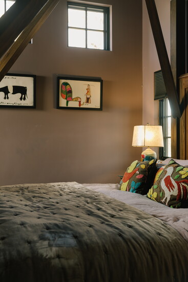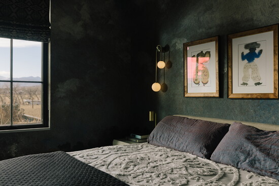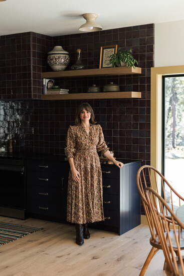 For the interiors, she explored styles and colors that she wanted to try throughout the years, but hasn’t had the right home or client. There’s an eggplant-purple kitchen, a cherry-red bunk room, ochre-brown tile in the bathroom, and mustard-yellow trim around the picture windows, creating a distinct juxtaposition with the surrounding land they love so much.