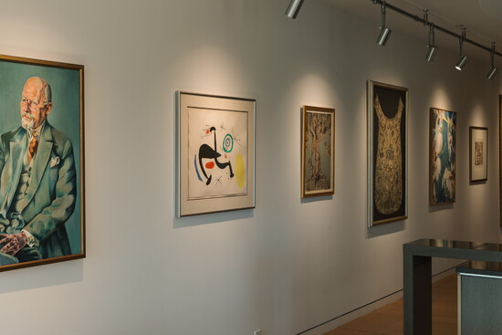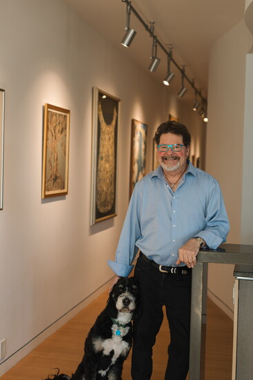 Hine built a full-scale jewelry workshop into the oversized primary closet and a painting studio for Gail in the guest suite. He designed the entry as a sixty-foot art gallery to display their art collection, many of which were painted by relatives.