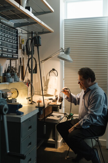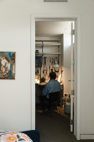 Hine also works on his 1969 Jaguar XKE and sees learning car body work as an extension of jewelry making at a larger scale. Between jewelry design, car restoration, and architecture, Hine does not differentiate one scale of design from another.