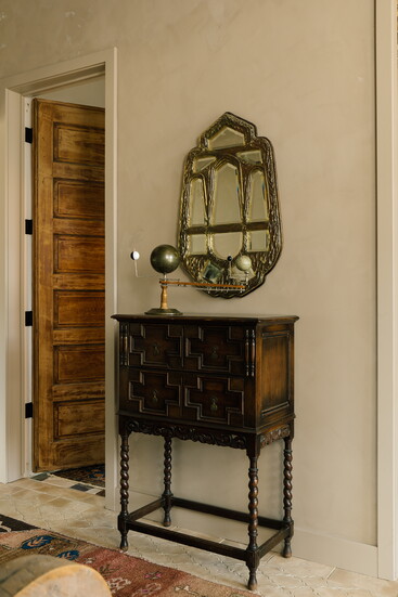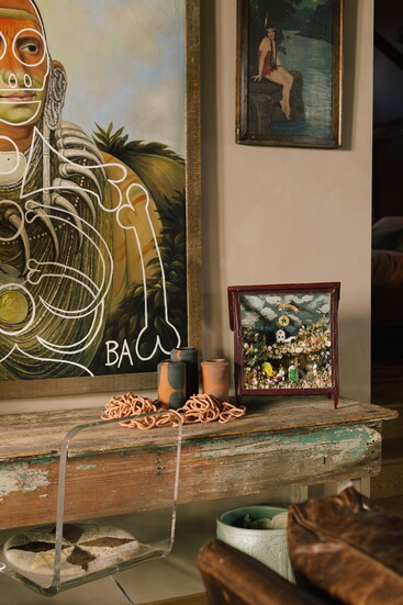 Many items are made by friends or family members, like the large Butch Anthony piece that greets guests right when they walk in and the Laura Morningstar pottery that accompanies it. Some were traded at a swap meet with friends, like the end table and barstools she traded for her current bathroom cabinet.