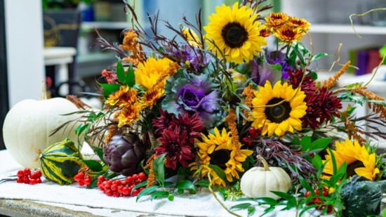Abloom's designer, Ellie Golden, curated this cornucopia using florals as their medium of choice. We see abundant autumn flowers, bright sunflowers, chrysanthemums, upright amaranthus, and mountain ash. Never one to limit themselves, the creative minds at Abloom integrated fresh kale, artichokes, gourds, trendy white pumpkins, and mountain berries.