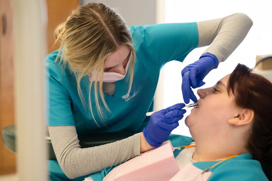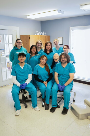Spending time at First Institute during our photo shoot offered a firsthand look at what sets it apart. Conversations are easy, laughter is common, and the environment feels relaxed yet purposeful. In the classrooms, Medical Assisting students practiced drawing blood on one another, calmly coached by instructors who treated the moment with both precision and reassurance. In the Massage Therapy program, a classroom was filled with massage tables where therapists-in-training worked with real clients while an instructor moved quietly from table to table, offering guidance in real time. The Dental Assisting classroom felt less like a school and more like stepping into a functioning dental office—complete with equipment, layout, and the rhythm of a professional practice.