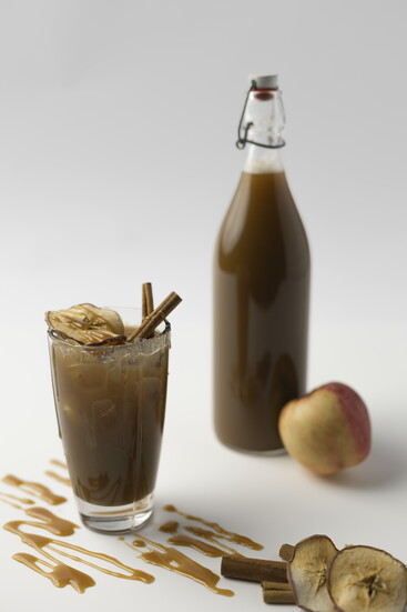 To serve, pour over ice in individual glasses and garnish with an apple slice or cinnamon stick and a drizzle of caramel if desired