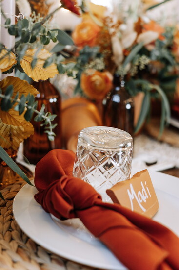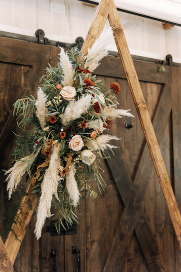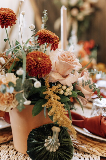Create a low centerpiece using a blend of fresh blooms (like roses and eucalyptus) and dried elements (like pampas grass or bunny tails). Stick to a palette of soft peaches, creams, and warm rusts.