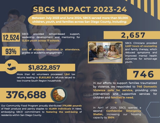 Today, SBCS’s programs span a vast variety of support for youth and families. Their team of over 500 employees work alongside schools, police departments, family resource centers, and affordable housing locations to ensure community members have what they need. Their programs are designed to support basic needs like food and housing, as well as emergency support for families experiencing domestic violence, addiction, or youth in the juvenile justice system. At the heart of it, if a family in the San Diego region is struggling with any sort of personal, physical, or emergency need—SBCS has a program to help them take steps toward a brighter situation.