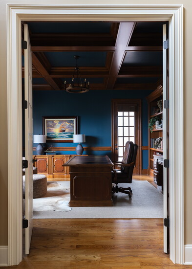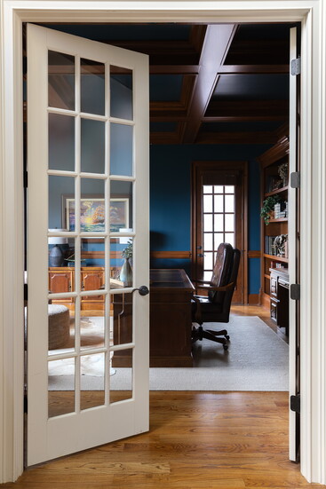 “We chose to color drench the walls and ceiling with a rich, vibrant blue green called Seaworthy (Sherwin-Williams SW7620) that balances the beautiful, original cherrywood trim, bookcases and coffered ceiling,” Thompson says. “We softened it all with layered area rugs, tufted swivel chairs, a boucle ottoman and plaid drapery panels.