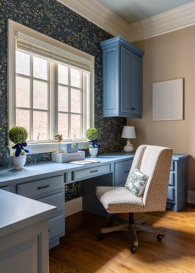 “Designers are using pops of color on cabinetry instead of playing it safe with whites, grays or creams,” she says. “We also added a nature-themed Rifle Paper Co. wallpaper behind the desk cabinets to bring the outdoors inside for this family of outdoor enthusiasts.”
