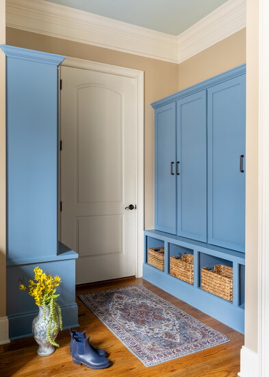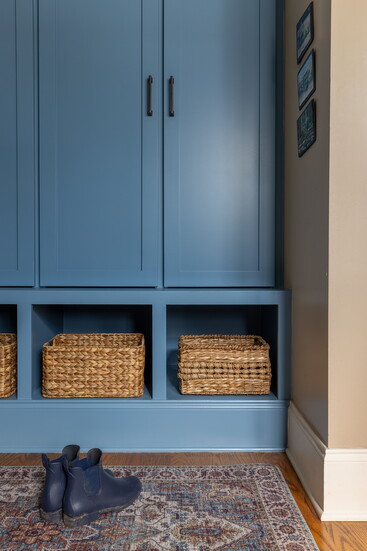 Thompson had her custom cabinet maker add doors and crown molding to formerly open shelves, creating a more finished and elevated drop zone that keeps messy coats and shoes out of site.
