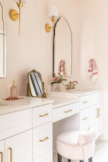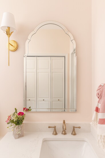 The girls' bath features a soft hush of a blush paint and built-in cabinetry. Zeillige-effect tile was installed in the shower/bath. Accessories include original art.
