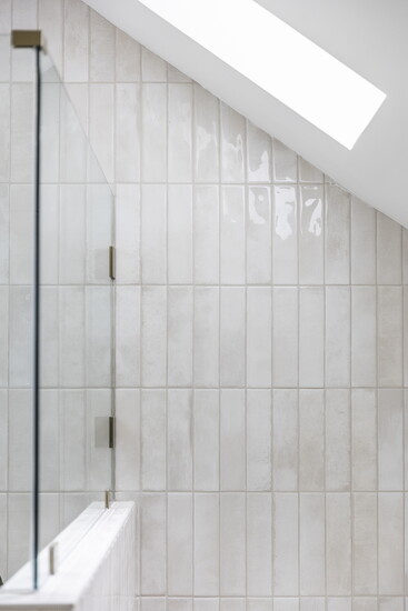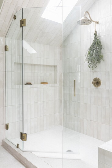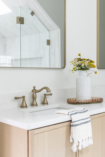 In the primary bath, a maximum shower was installed without the tub. Special features include undulated stacked ceramic subway tile, all the way up to the ceiling and surrounding skylight. Plumbing fixtures in Champagne Bronze offered a nod to the past. White oak slim shaker cabinets offered the finishing touch.