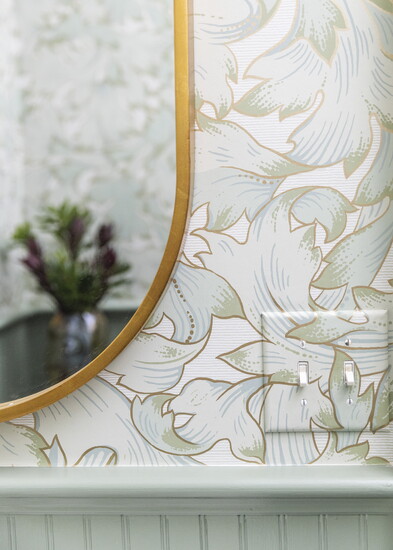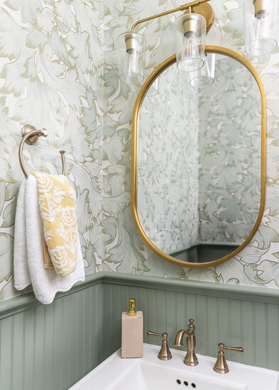 Historic elements came together in the half bath in the form of painted beadboard, modern craftsman style wallpaper, antique brass fixtures and cafe curtains.