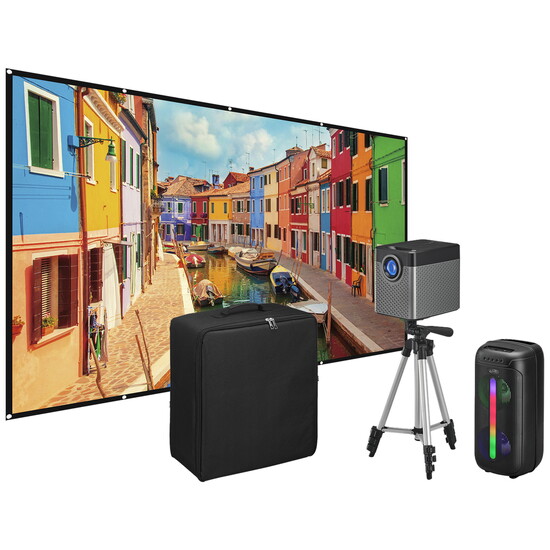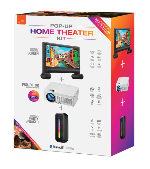 Projector, 120-inch inflatable screen, and bluetooth speaker. $299.99 at ILiveElectronics.com